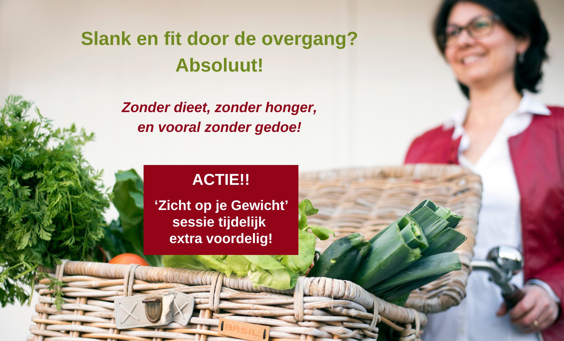Zie jij je gewicht en tailleomvang steeds toenemen? Voel je je niet fit en zit je niet lekker in je vel? Leg je er niet bij neer, het hoeft niet zo te zijn. Zelfs in de overgang is het mogelijk om gewicht te verliezen en overgangsklachten fors te verminderen. In mijn nieuwe e-book leg ik je graag uit hoe je in 7 stappen grip kunt krijgen op de overgang. Vraag mijn gratis e-book hier aan.
